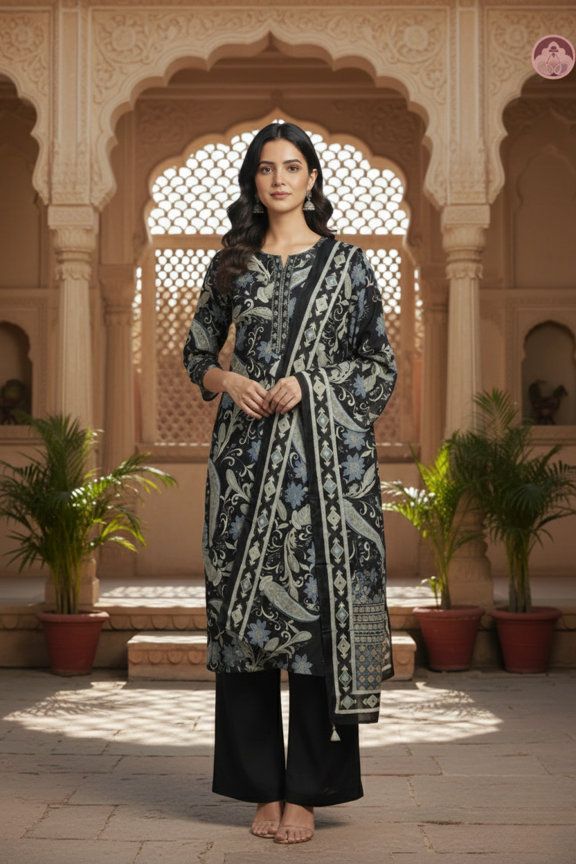 Elevate your everyday ethnic wardrobe with this Black Garden Ethnic Printed Suit Set, designed for women who love effortless elegance. Crafted in a soothing black base adorned with graceful floral and paisley-inspired prints, this kurta set blends traditional charm with modern comfort. The coordinated cotton dupatta adds a refined finishing touch, making it ideal for both casual and festive wear.