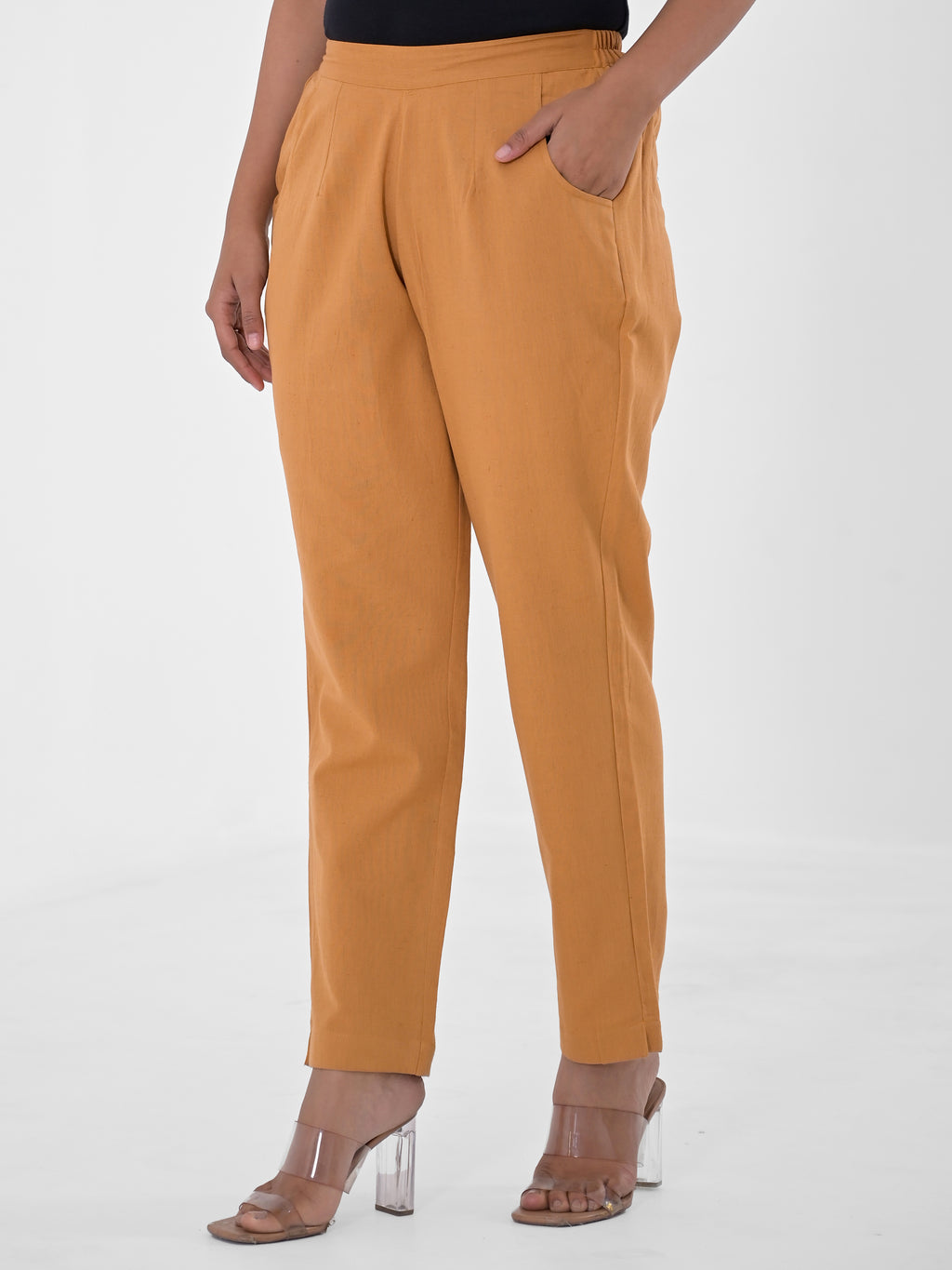 Caramel-colored straight pants crafted from soft and breathable cotton fabric for comfort and style. Featuring two pockets on each side for practicality and convenience. With a half-elasticated, mid-rise waist, they offer flexibility and ease of wear, perfect for versatile dressing with a touch of warmth and sophistication.