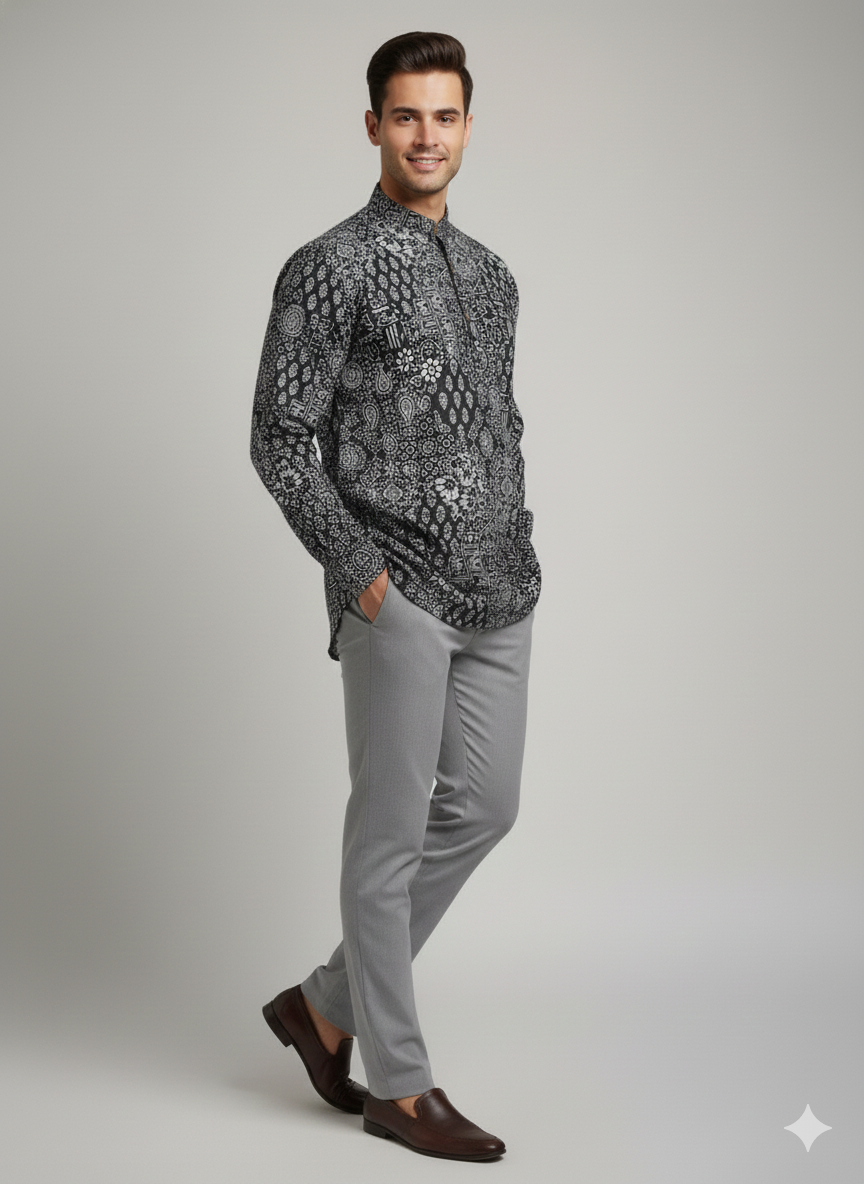 Upgrade your everyday ethnic style with the Ishaan Urban Ethnic Printed Mash Cotton Short Kurta, designed for modern comfort with a traditional edge. Crafted from soft, breathable mash cotton fabric, this kurta features an elegant monochrome ethnic print that adds a refined, urban appeal.
