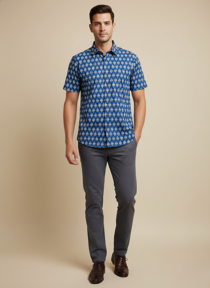 Elevate your everyday style with the Riyaan Blue Cotton Men’s Shirt, crafted for comfort and effortless sophistication. Made from breathable, high-quality cotton, this shirt features an elegant all-over traditional-inspired print on a rich blue base, giving it a refined yet contemporary appeal.