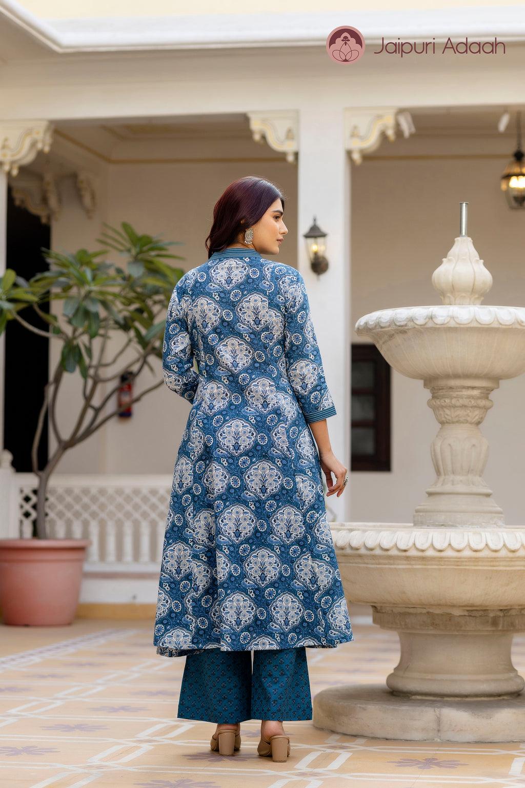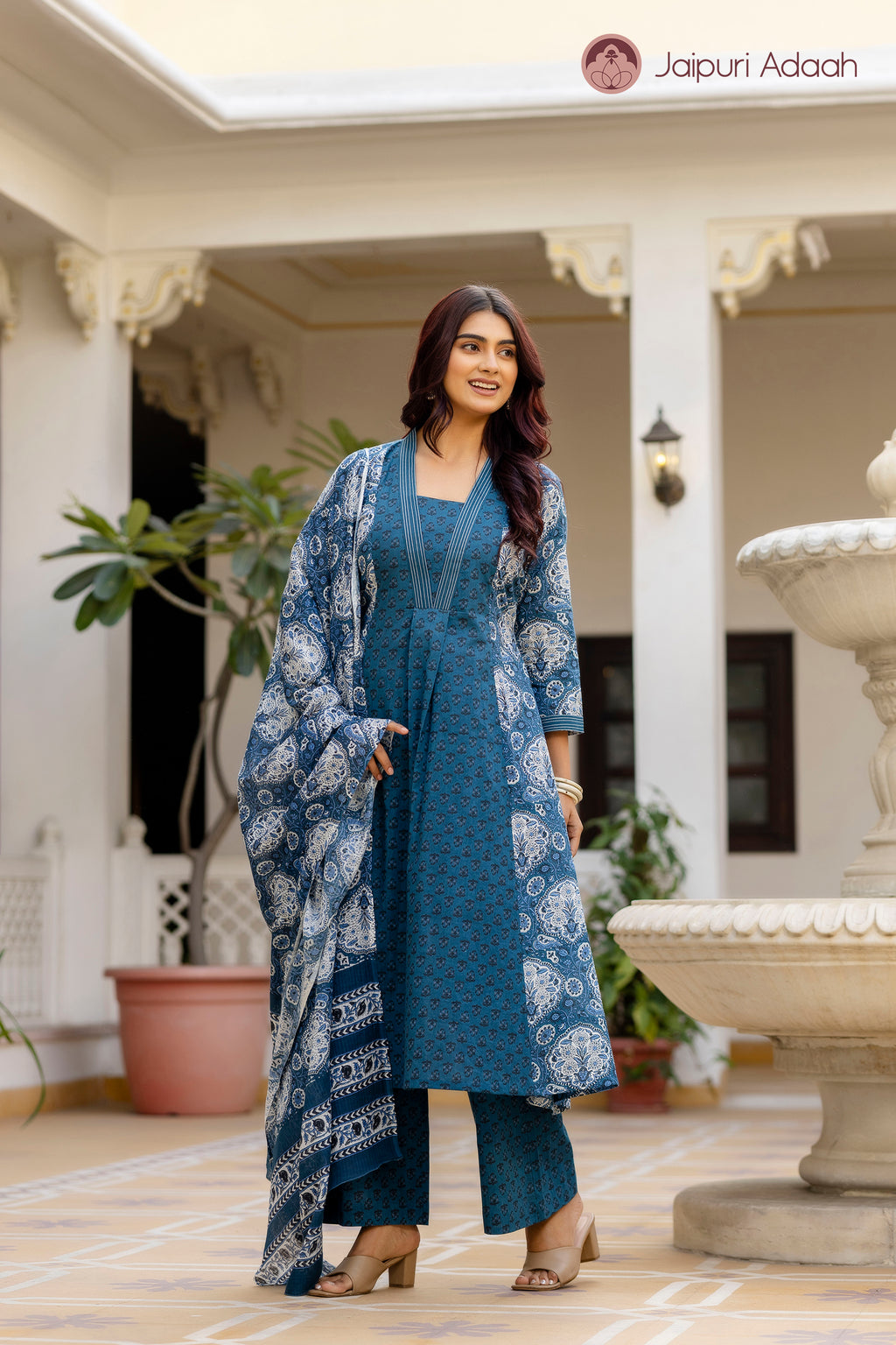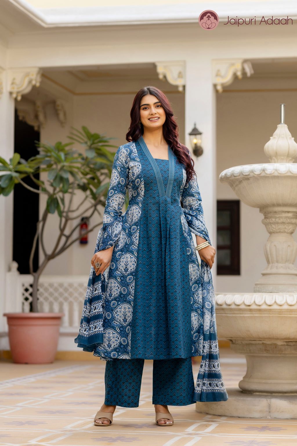 Inspired by the timeless beauty of royal courtyards, this indigo blue ethnic suit set exudes heritage elegance and refined charm. Crafted in soft, breathable cotton, the kurta is adorned with intricate traditional prints that celebrate classic Indian artistry. The coordinated bottom completes the look, while the feather-light mul cotton dupatta drapes effortlessly, adding a touch of understated sophistication.