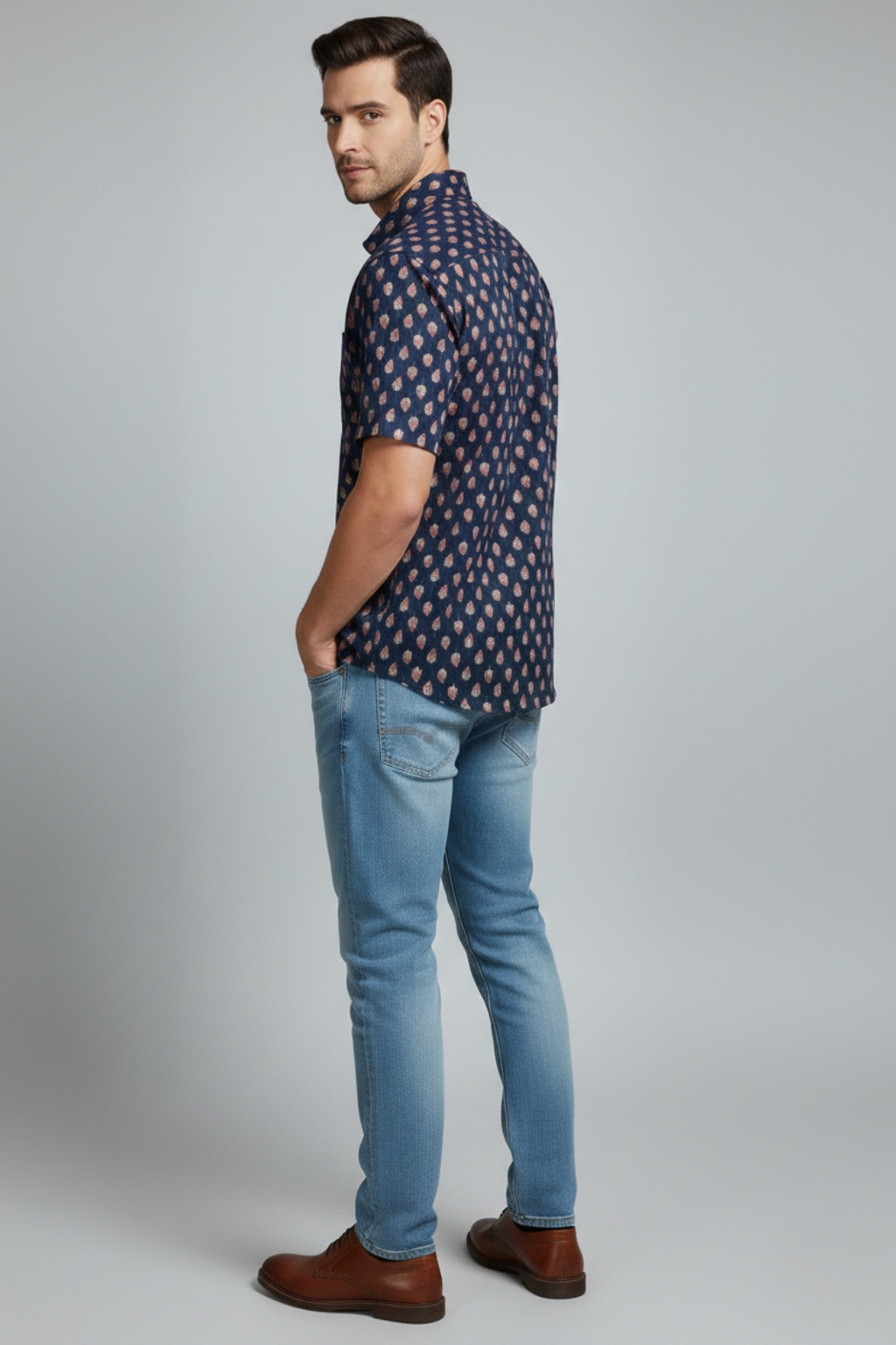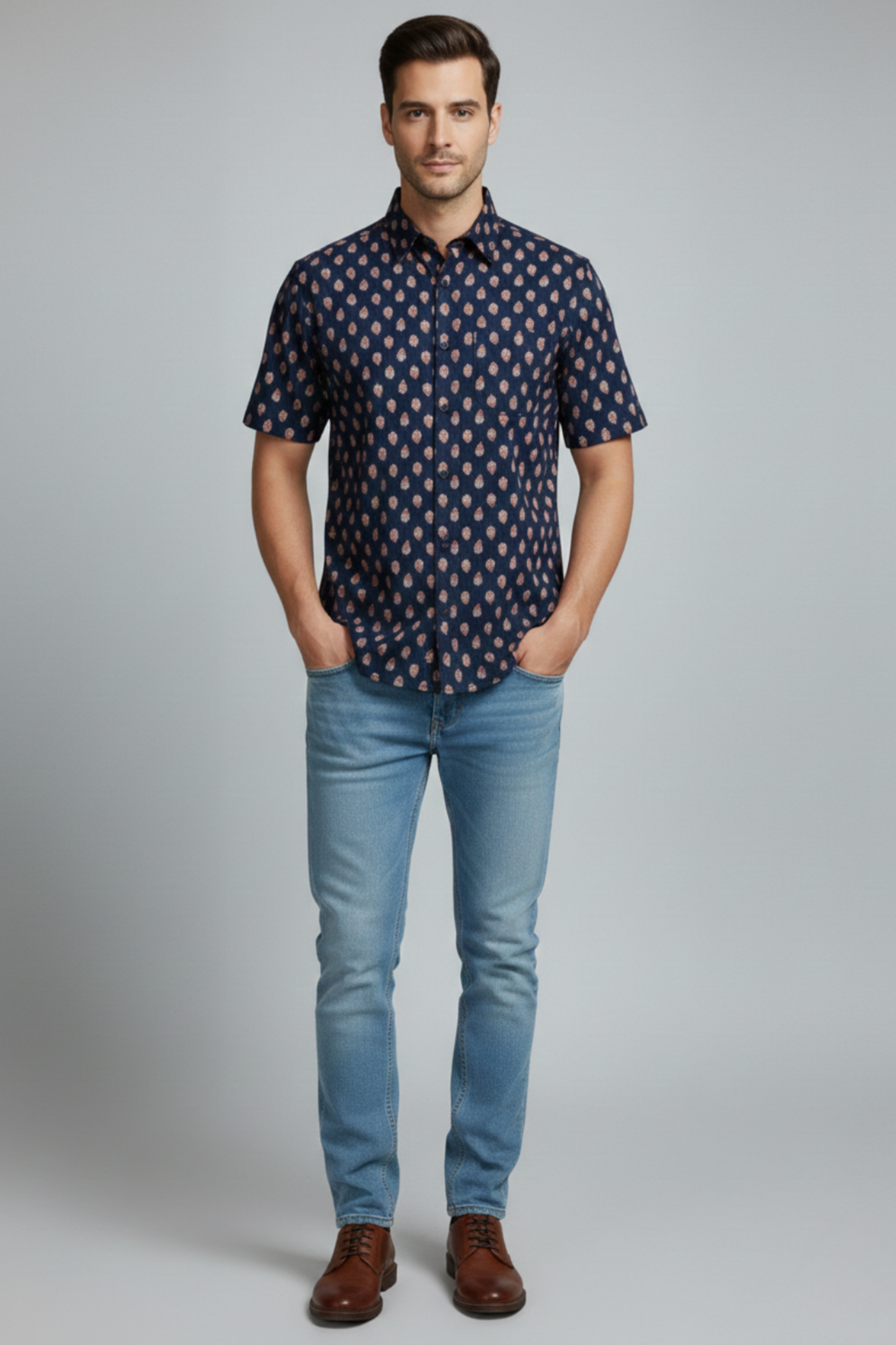 Refresh your everyday wardrobe with the Aaryan Blue Leaf Print Cotton Men’s Shirt. Crafted from premium-quality cotton fabric, this shirt ensures breathability and all-day comfort. The elegant all-over leaf print on a rich blue base adds a stylish yet subtle touch, making it perfect for casual outings and smart-casual occasions. Designed with half sleeves and a relaxed fit, it offers effortless style with maximum comfort. Pair it with jeans or chinos for a polished, contemporary look.