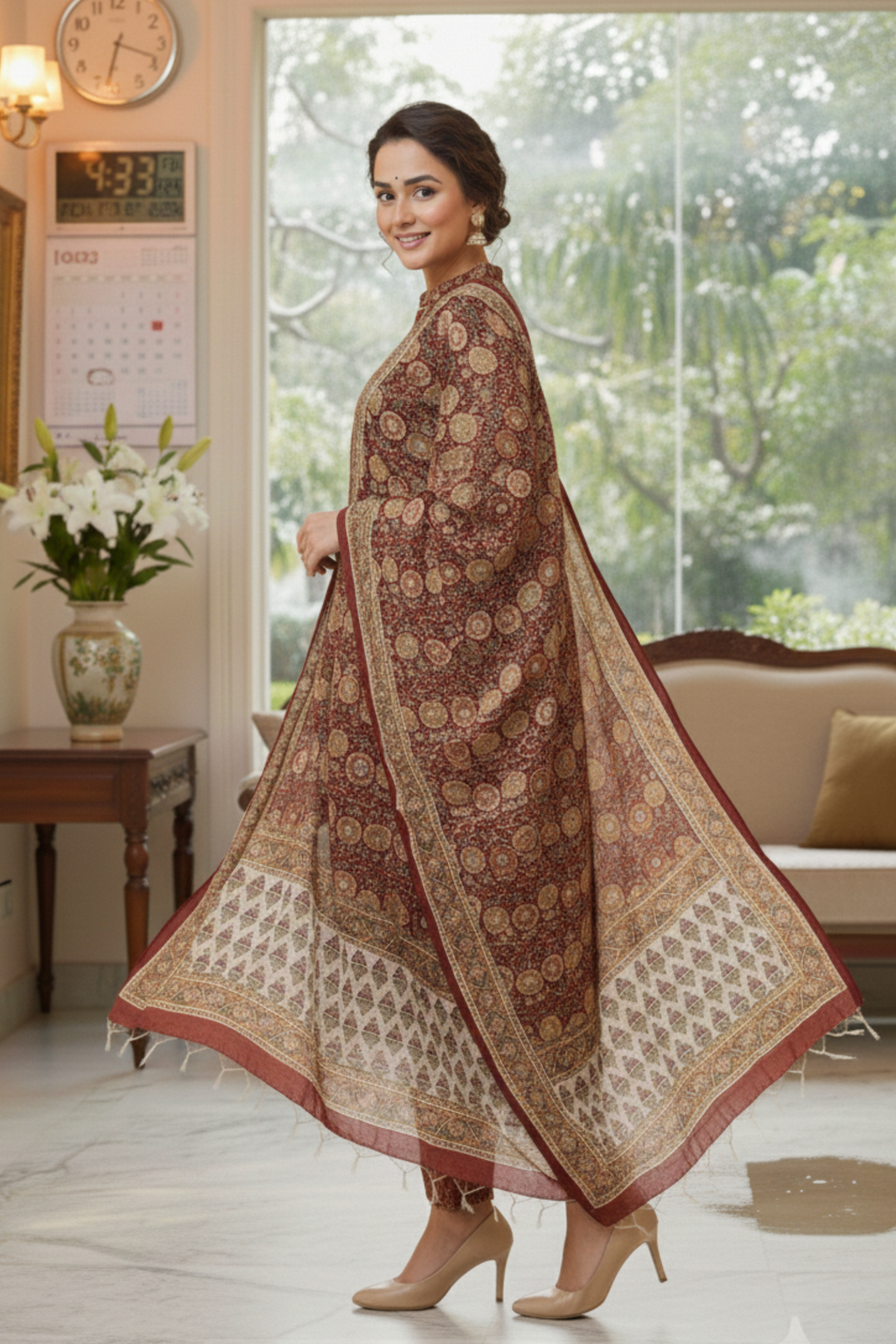Step into timeless elegance with this Elegant Maroon Floral Printed Chanderi Suit Set, designed to bring together traditional charm and refined sophistication. Crafted from luxurious Chanderi fabric, the kurta features delicate all-over floral prints that enhance its rich maroon base, giving it a graceful and festive appeal.