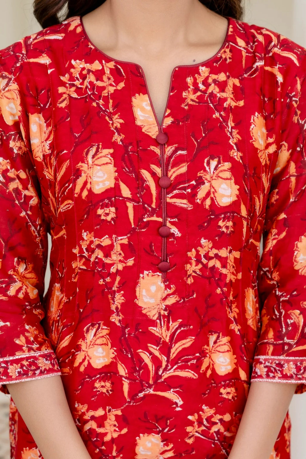 Express your sophisticated style in this Falak Chintz block Print Pintuck Chanderi Suit Set. This elegant ensemble features a graceful blue floral print, delicately rendered by hand block print for an exquisite effect. With a straight suit set and cotton pants, you'll be sure to make an ethnic wear statement.