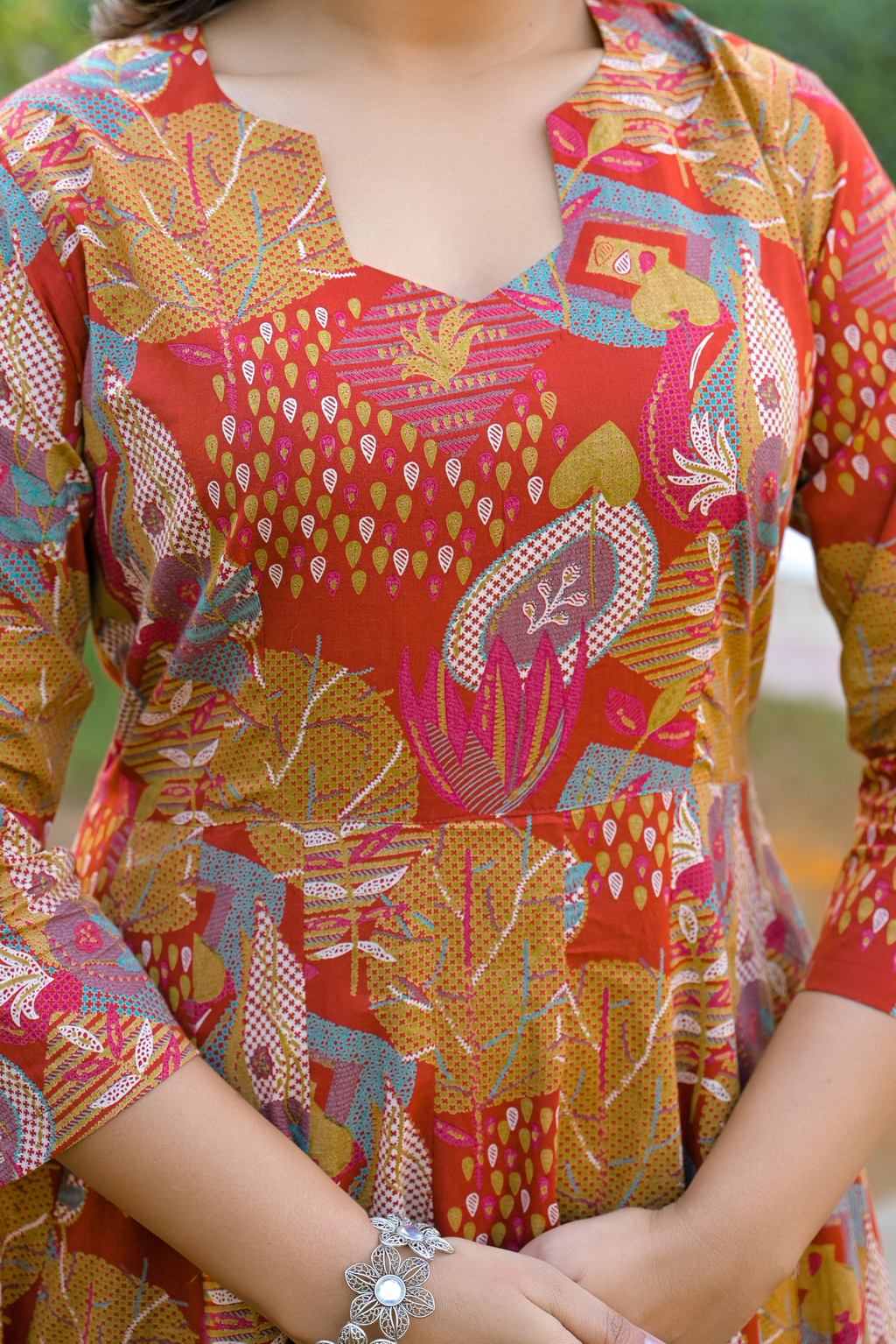 Elevate your ethnic wardrobe with this beautifully crafted rust red printed Anarkali suit set, designed to bring a graceful festive charm to your look. The kurta features a rich blend of floral and leaf motifs in warm autumn tones, giving it a vibrant yet elegant appeal. The flowing Anarkali silhouette adds effortless movement, making it perfect for festive gatherings, casual outings, or daytime celebrations.