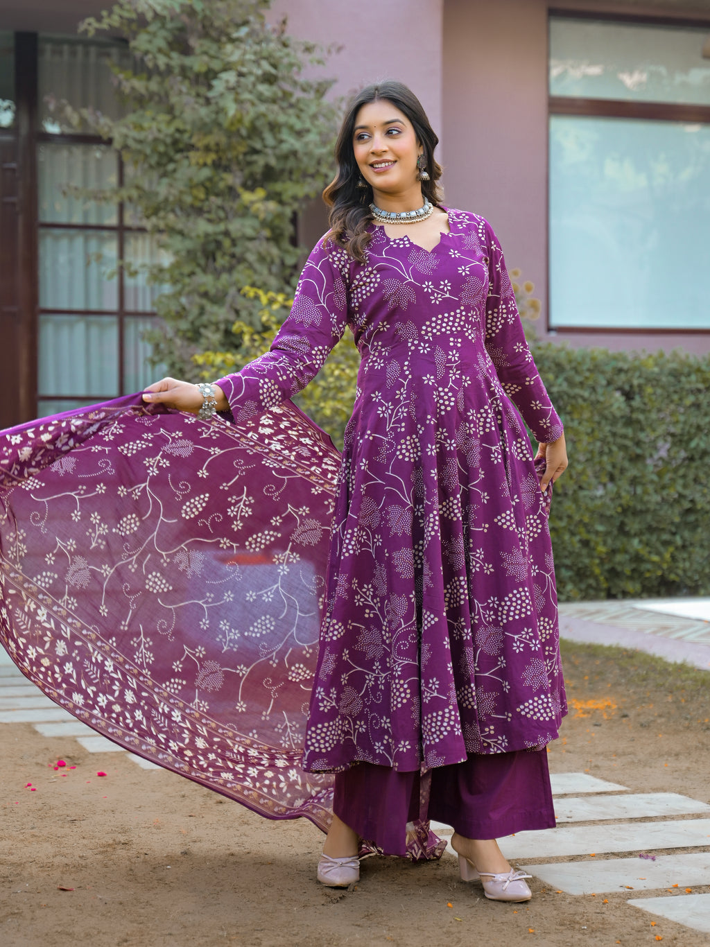 The outfit appears to be made from a lightweight, flowy fabric, most likely cotton, cotton blend, or chiffon/georgette for the dupatta. The kurta and palazzo seem to have a soft, breathable, matte-textured fabric, typical of high-quality cotton or modal blends often used in traditional Indian wear for comfort and drape. Kurta & Palazzo Fabric Likely cotton, modal cotton, or a cotton-silk blend, given the smooth fall and structured yet comfortable appearance. The fabric has a printed design, featuring intricate white floral and vine motifs (possibly inspired by bagru or block-print styles). It looks opaque, breathable, and suitable for everyday as well as semi-festive wear. Dupatta Fabric Appears more sheer and lightweight, suggesting chiffon, organza, mulmul, or soft kota cotton.Fabric - Pure Cotton