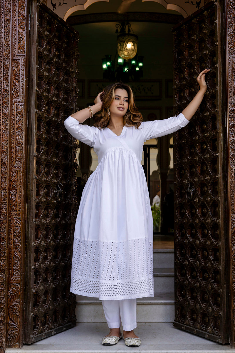 Dare to wear this Noor White Angrakha Style Cotton Kurta Pant Set! The intricate shifli touch at the bottom adds a touch of elegance and adventure. Made with comfortable cotton fabric, this set is perfect for those who love to take risks and stand out from the crowd.