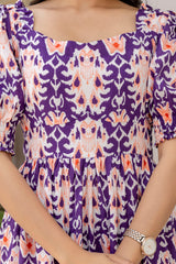 Indulge in the luxurious elegance of our Perfora ikkat purple cotton flared dress. Exquisitely crafted with intricate details, this dress boasts a flattering silhouette that will enhance your natural beauty. Made with premium cotton, it offers ultimate comfort and breathability. Elevate your wardrobe with this exclusive piece of art.