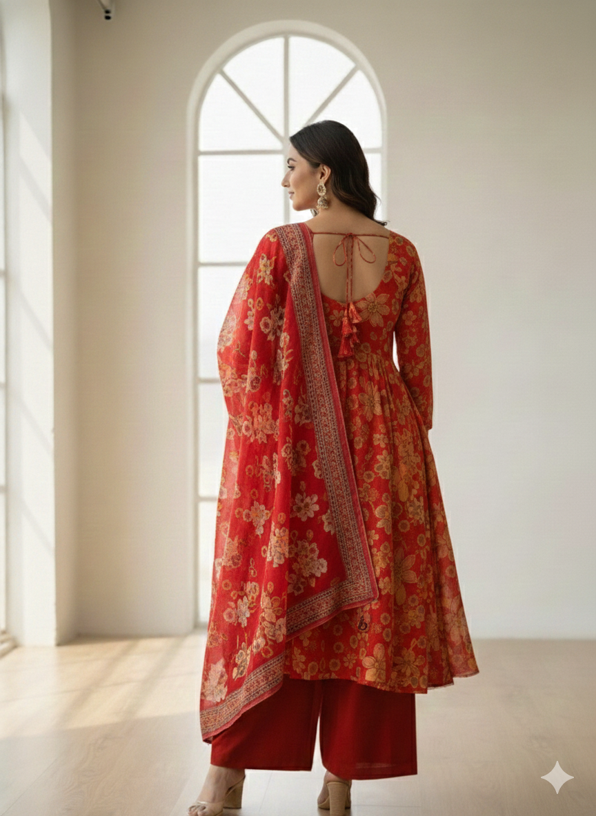 Zarika Floral Red Anarkali Suit Set with Digital Print Dupatta