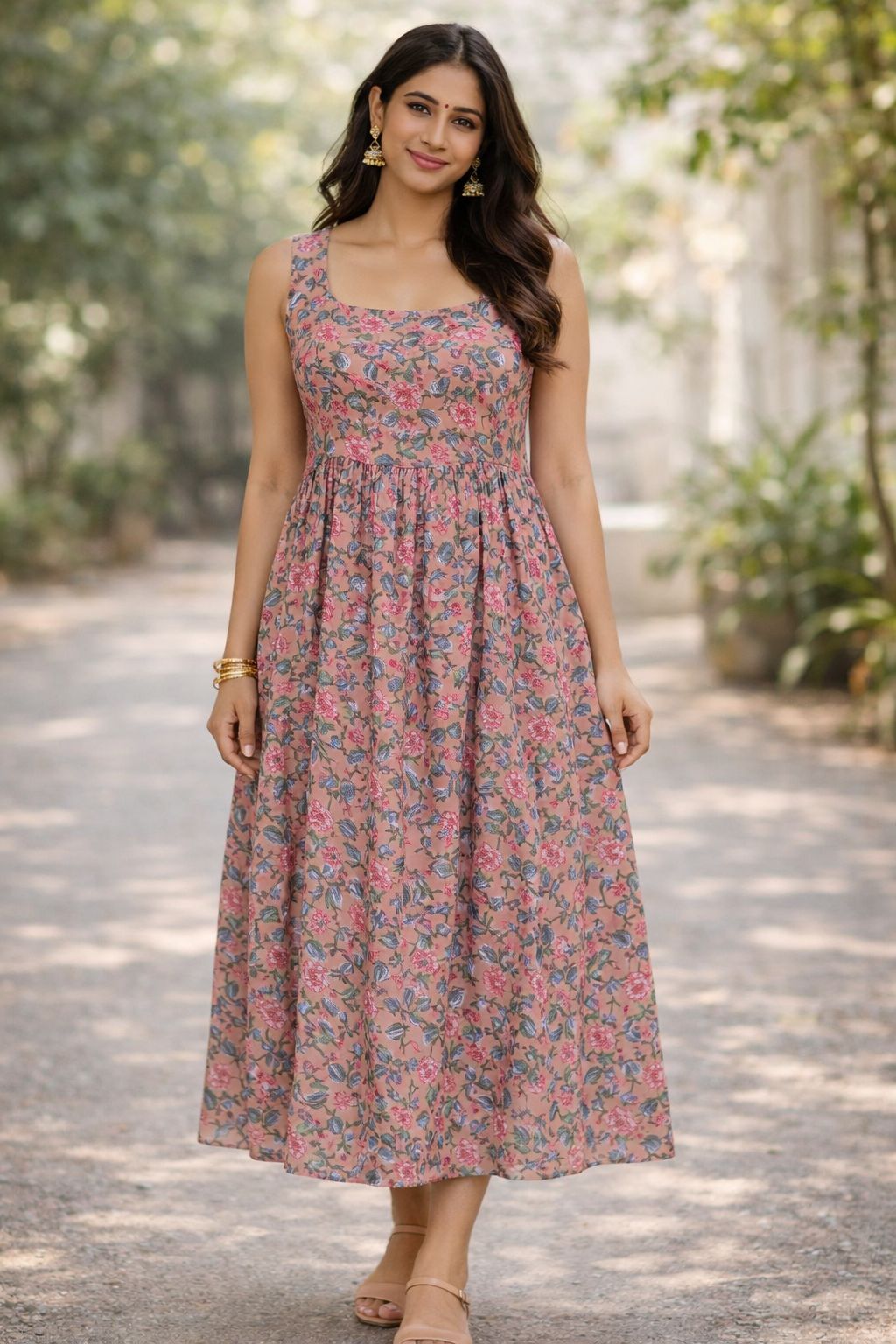 Crafted from pure, breathable cotton, it features a sleeveless silhouette and a gently gathered waistline that offers a flattering yet relaxed fit. The lightweight fabric flows gracefully, making it perfect for brunch outings, garden parties, vacations, casual daywear, or relaxed festive moments.
