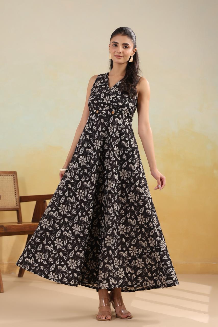 Featuring a striking black base adorned with soft ivory floral motifs, this dress blends classic charm with modern sophistication. The wrap-style V-neckline enhances the silhouette, while the double-button detail adds a touch of chic refinement. Its wide flared hem gives beautiful movement, making it perfect for both casual outings and special occasions.