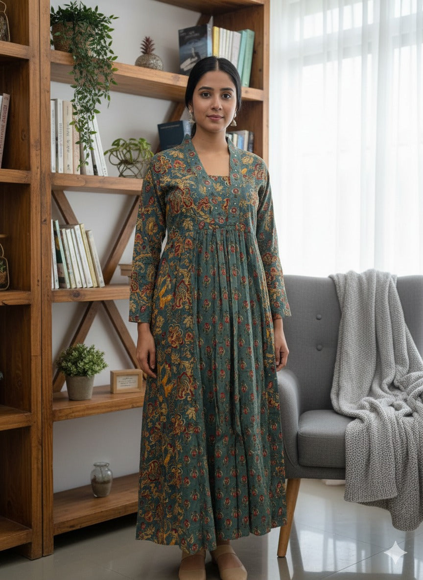 Step into timeless elegance with the Eira Teal Heritage Print Anarkali Kurti! This stunning piece celebrates traditional craftsmanship with a contemporary twist, featuring intricate heritage prints in gorgeous teal tones. The classic Anarkali silhouette flatters every frame with its graceful flare, while the rich color palette adds instant sophistication to your wardrobe. Perfect for festive occasions, family gatherings, or whenever you want to feel absolutely fabulous in authentic ethnic wear. Embrace your heritage with style and comfort!