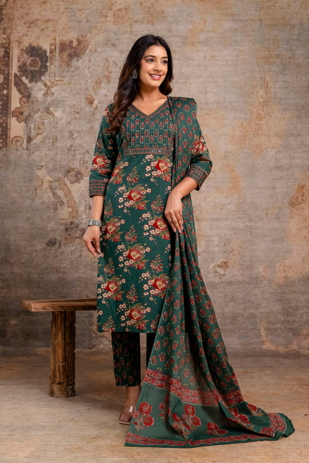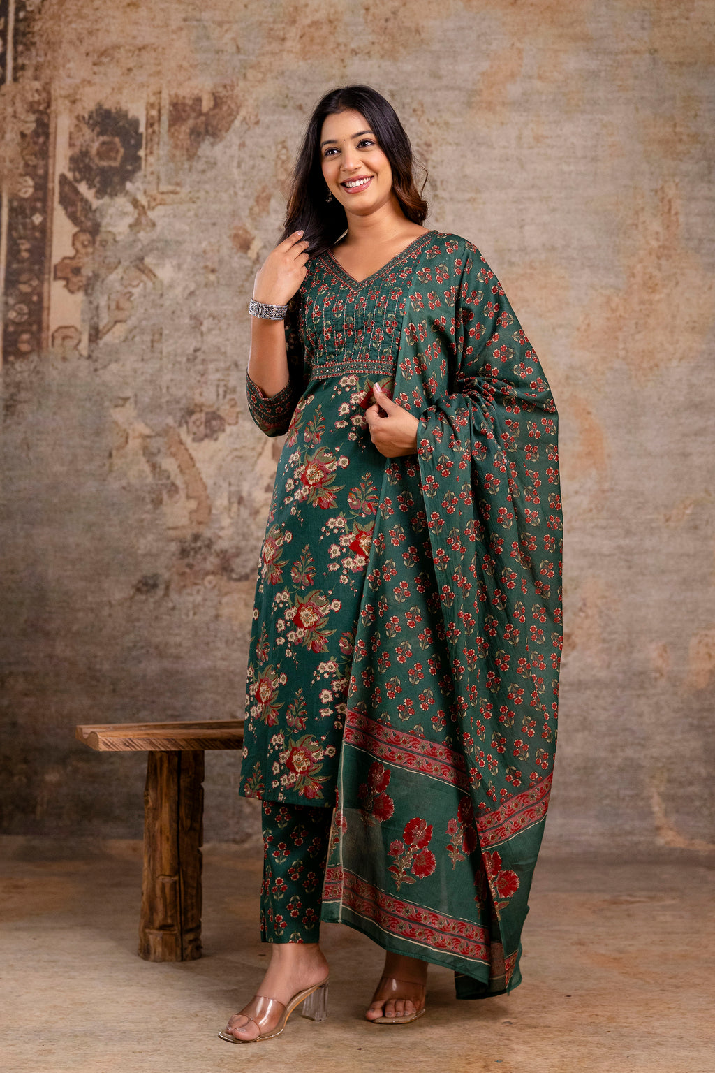 Green Floral Printed Cotton Straight Kurta Set with Dupatta