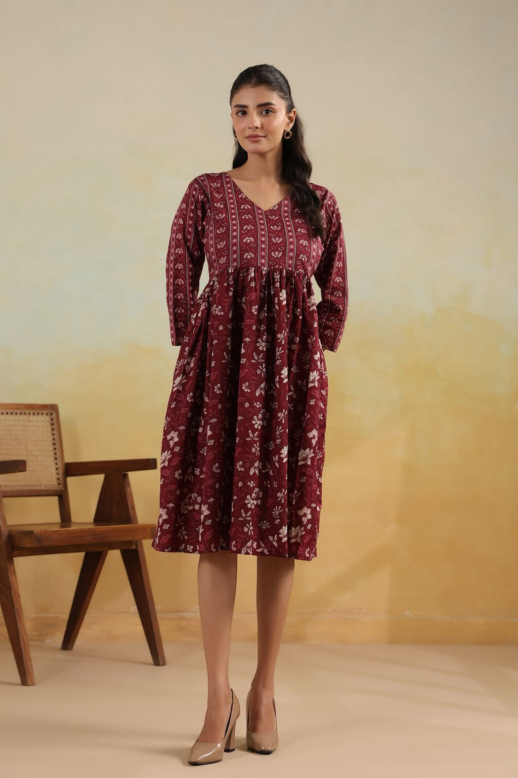 Designed with a rich maroon base and adorned with traditional blossom-inspired motifs, this dress beautifully blends ethnic charm with everyday comfort. The V-neckline and softly gathered waist create a flattering silhouette, while the long sleeves add a touch of grace and ease.