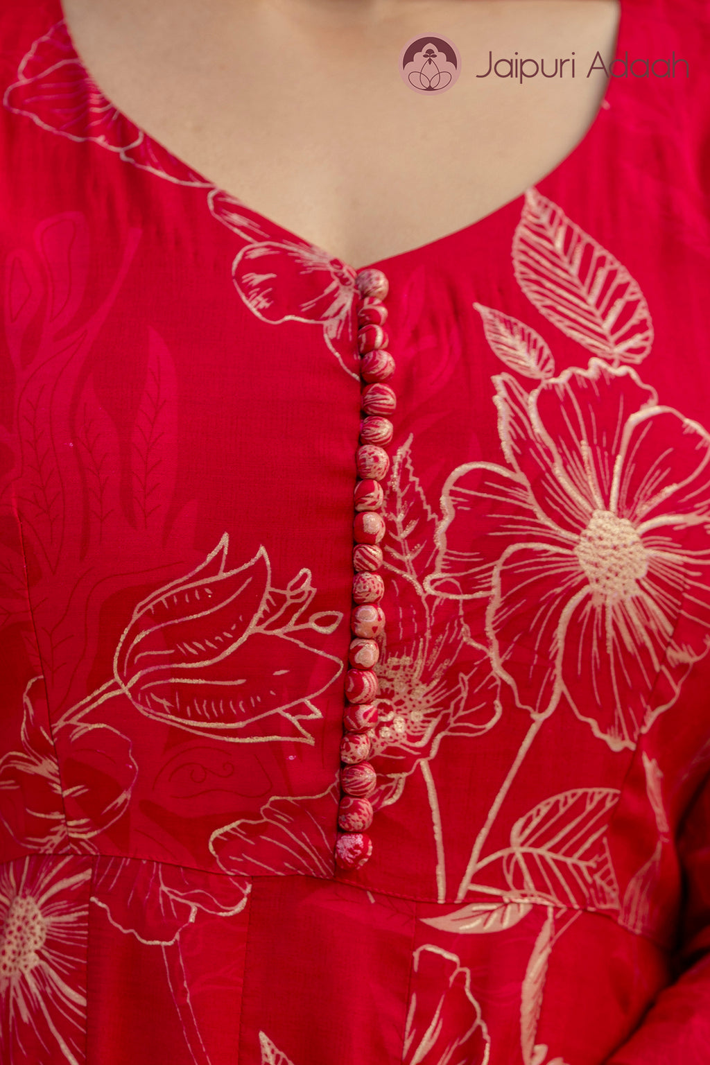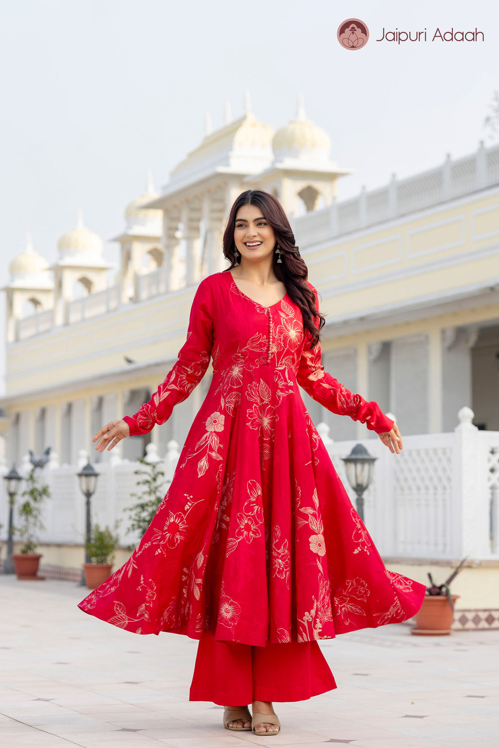 Radiating confidence and timeless charm, the “Mehru Scarlet Elegance” Floral Printed Kurta Pant set is designed for women who love bold hues with graceful detailing. The rich scarlet tone beautifully complements the delicate floral prints, creating a look that feels both festive and refined.