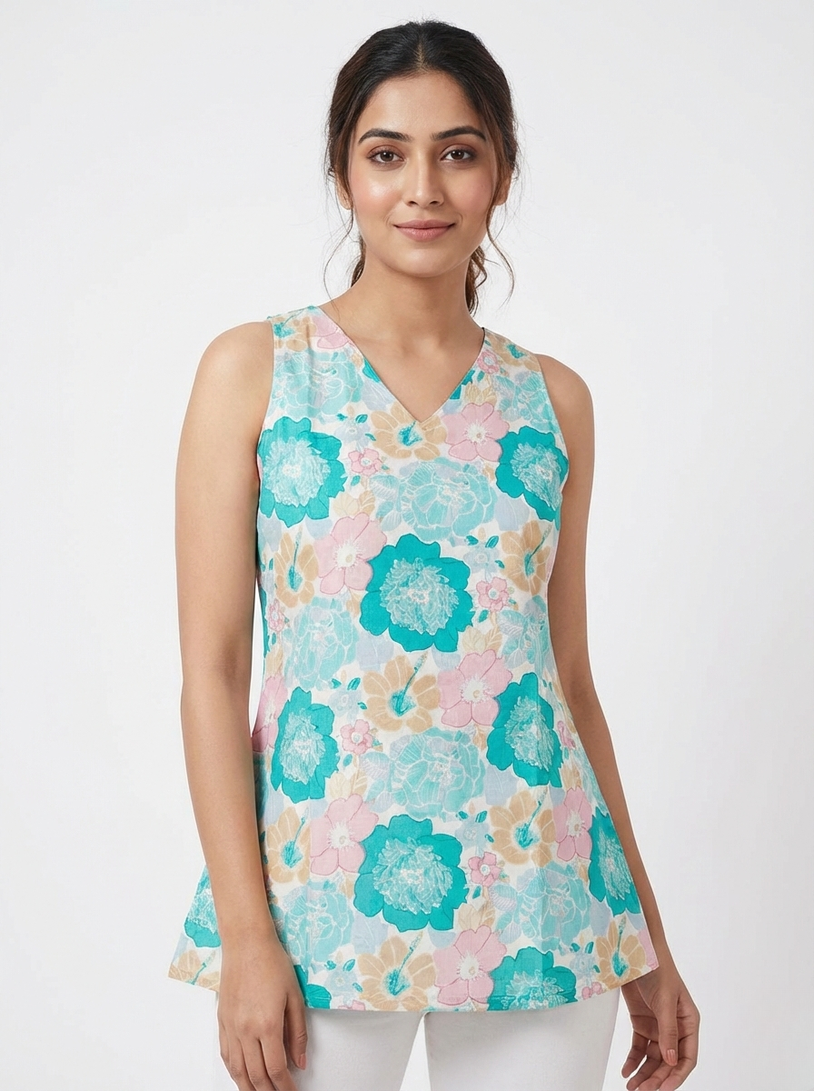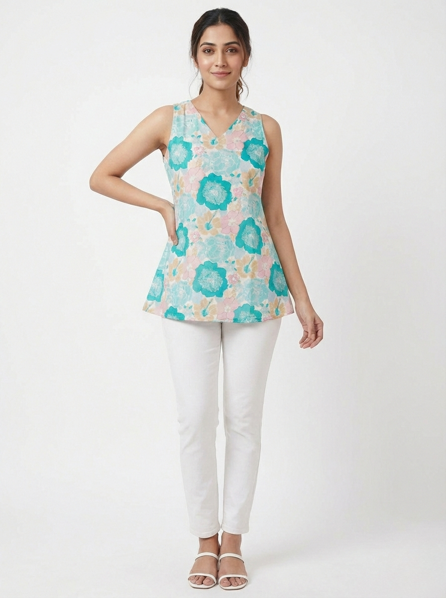 Refresh your everyday wardrobe with this Minimal Aqua Blue Floral Sleeveless Short Kurti. Designed with a soothing aqua blue base and soft pastel floral prints, this kurti offers a fresh and elegant look. The sleeveless design and smart short length make it lightweight and breathable, perfect for warm-weather comfort. Featuring a flattering silhouette and V-neckline, this kurti pairs effortlessly with white trousers, palazzos, or jeans, making it an ideal choice for daily wear, office wear, or casual outings.