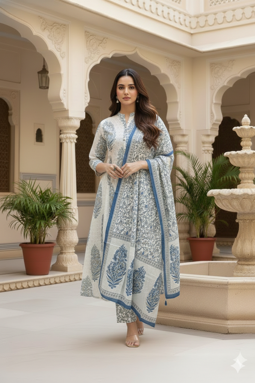 Step into timeless elegance with the Noor-e-Royal Printed A line Ensemble, a graceful blend of heritage charm and contemporary sophistication. Designed in soothing ivory tones with intricate blue floral and traditional motifs, this suit set radiates understated royalty and refined charm.