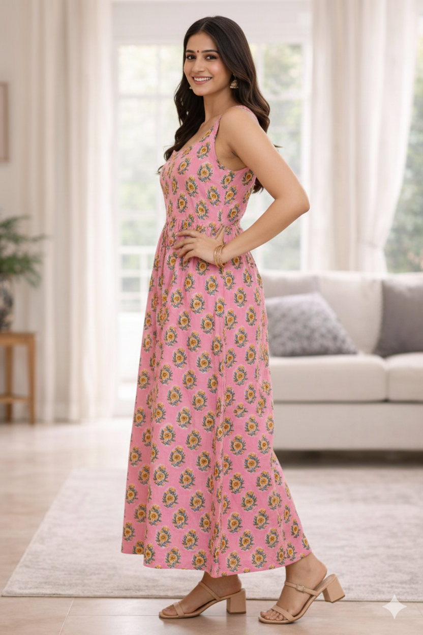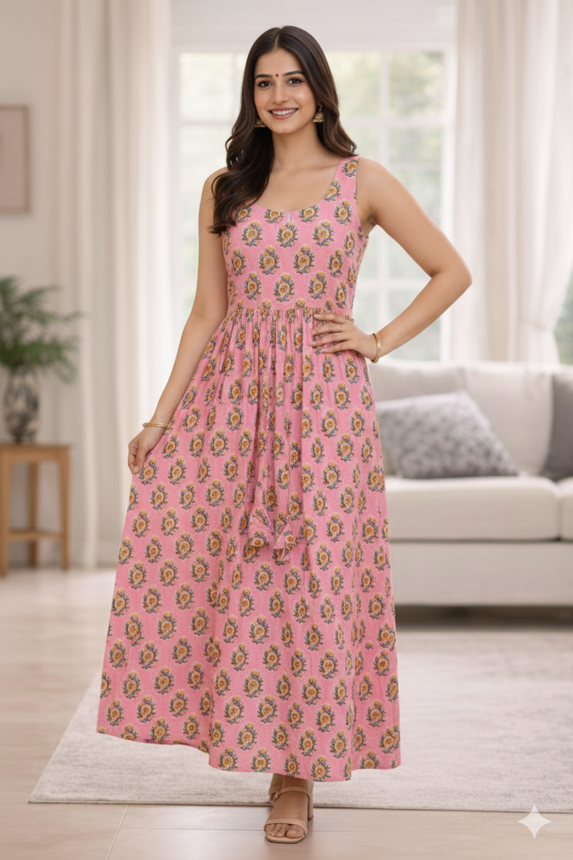 Elevate your everyday ethnic style with the Noorika Rosy Motif Sleeveless Long Dress, designed to blend comfort with timeless charm. Crafted from soft, breathable cotton, this dress features an all-over rosy floral motif that adds a fresh and feminine touch. The sleeveless silhouette and gently flared hem create an elegant flow, making it perfect for warm days and effortless outings.
