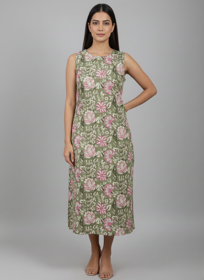 Add effortless elegance to your everyday ethnic wear with this Olive Green Floral Printed Sleeveless Straight Kurti. Designed with a calming olive green base and highlighted by soft pink and ivory floral prints, this kurti offers a fresh, graceful look. The straight-cut silhouette ensures a flattering fit, while the sleeveless pattern keeps it light, airy, and ideal for warm-weather comfort. Easy to style and versatile, this kurti is perfect for daily wear, office wear, casual outings, or relaxed gatherings.