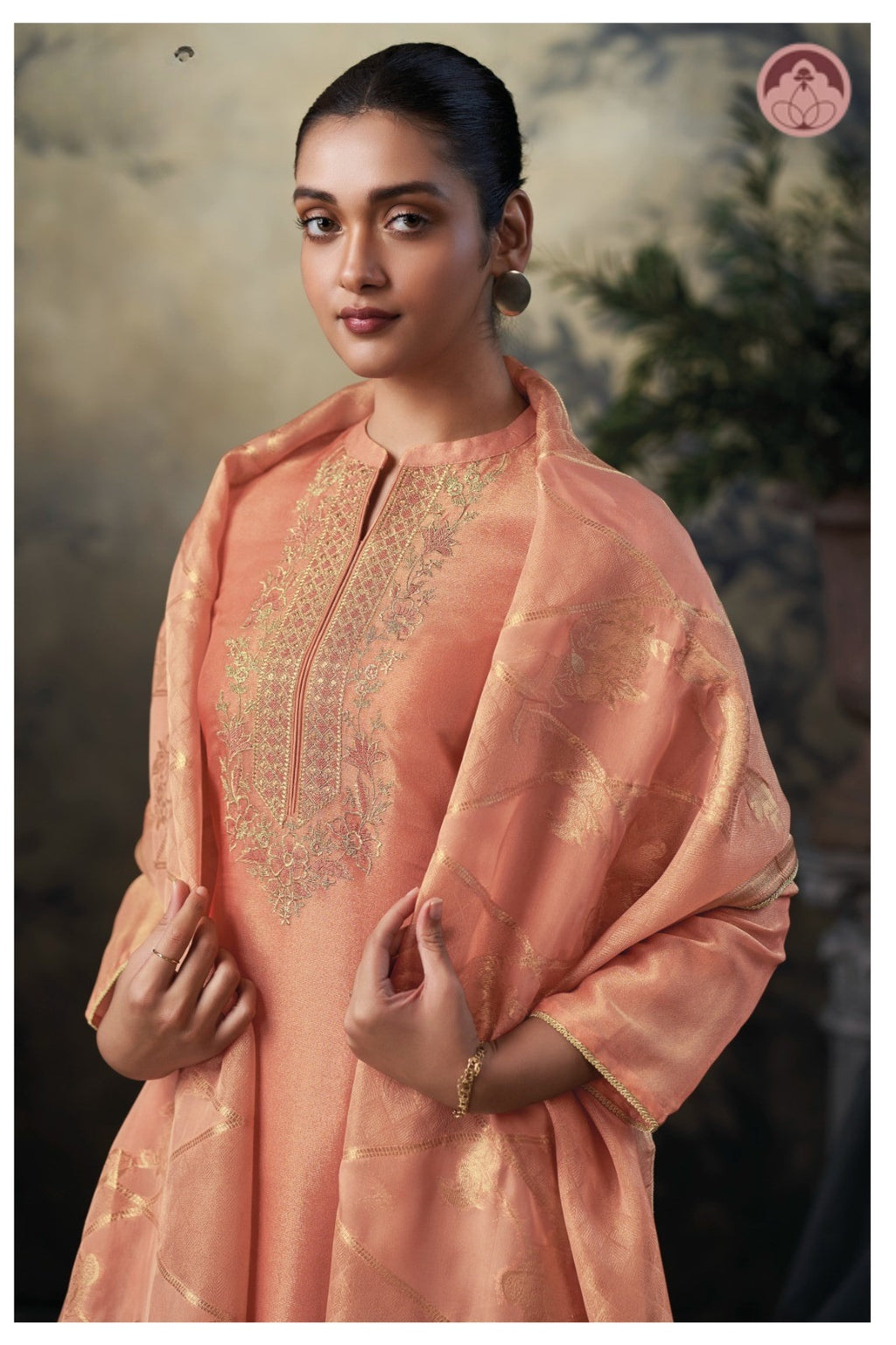 Radiate timeless charm in our Peach Glow Silk Elegance Suit Set, crafted from luxurious silk fabric that drapes effortlessly with a natural sheen. The soft peach hue exudes sophistication, perfectly complemented by intricate zari embroidery on the neckline and borders. TOP- PREMIUM PURE BEMBERG SILK JACQUARD SOLID COLOR WITH EMBROIDERY, EMBROIDERY LACE WITH JARI LACE ON DAMAN AND SLEEVES.BOTTOM- PREMIUM PURE VISCOSE SILK SOLID COLOR.DUPATTA- PREMIUM PURE ORGANZA SILK JACQUARD WITH JARI LACE BORDER.TYPE-UNSTITCHED