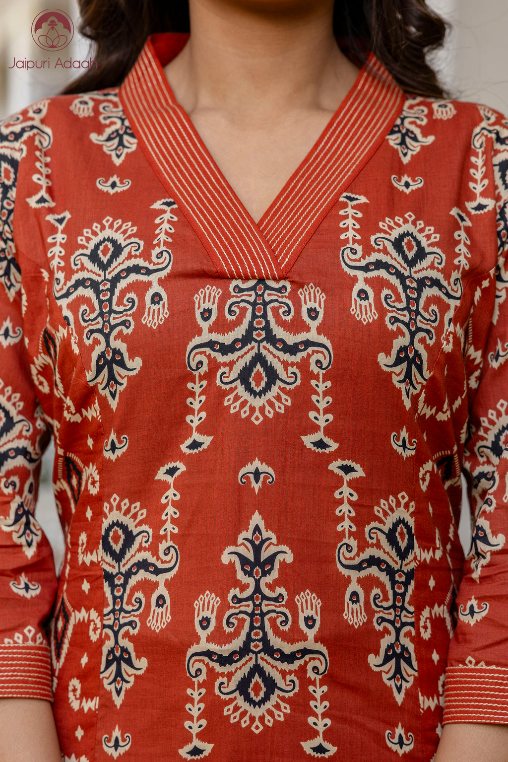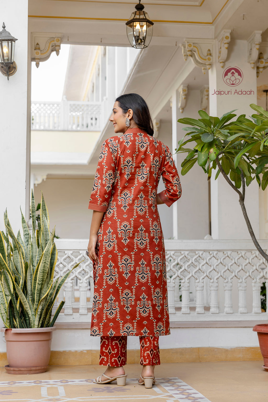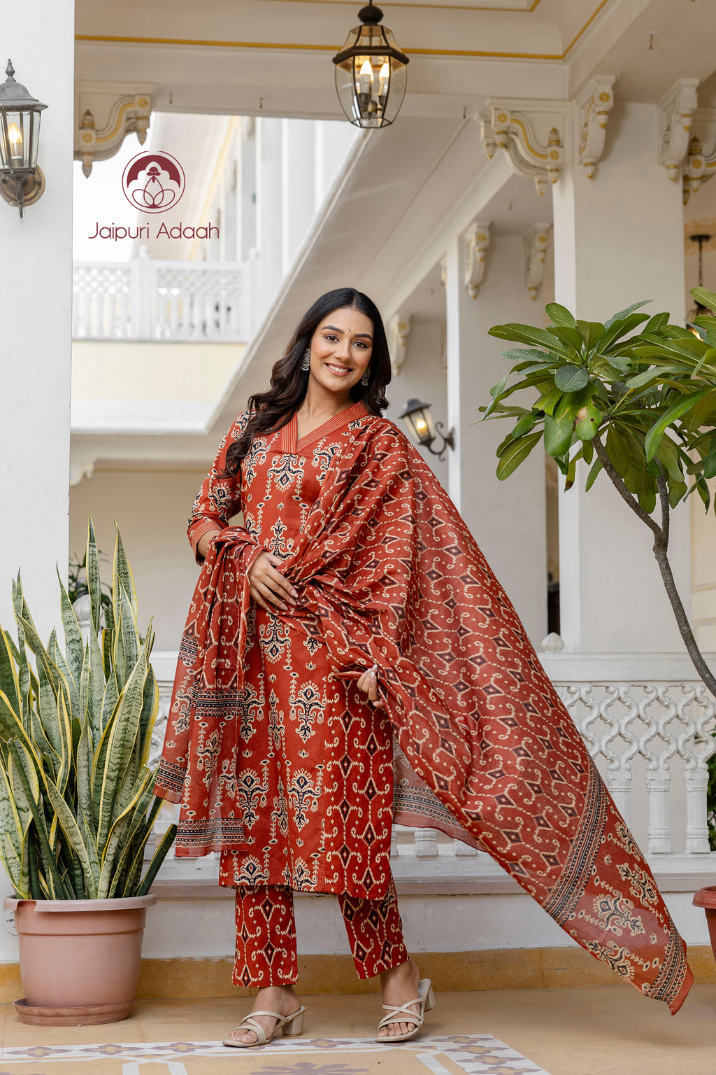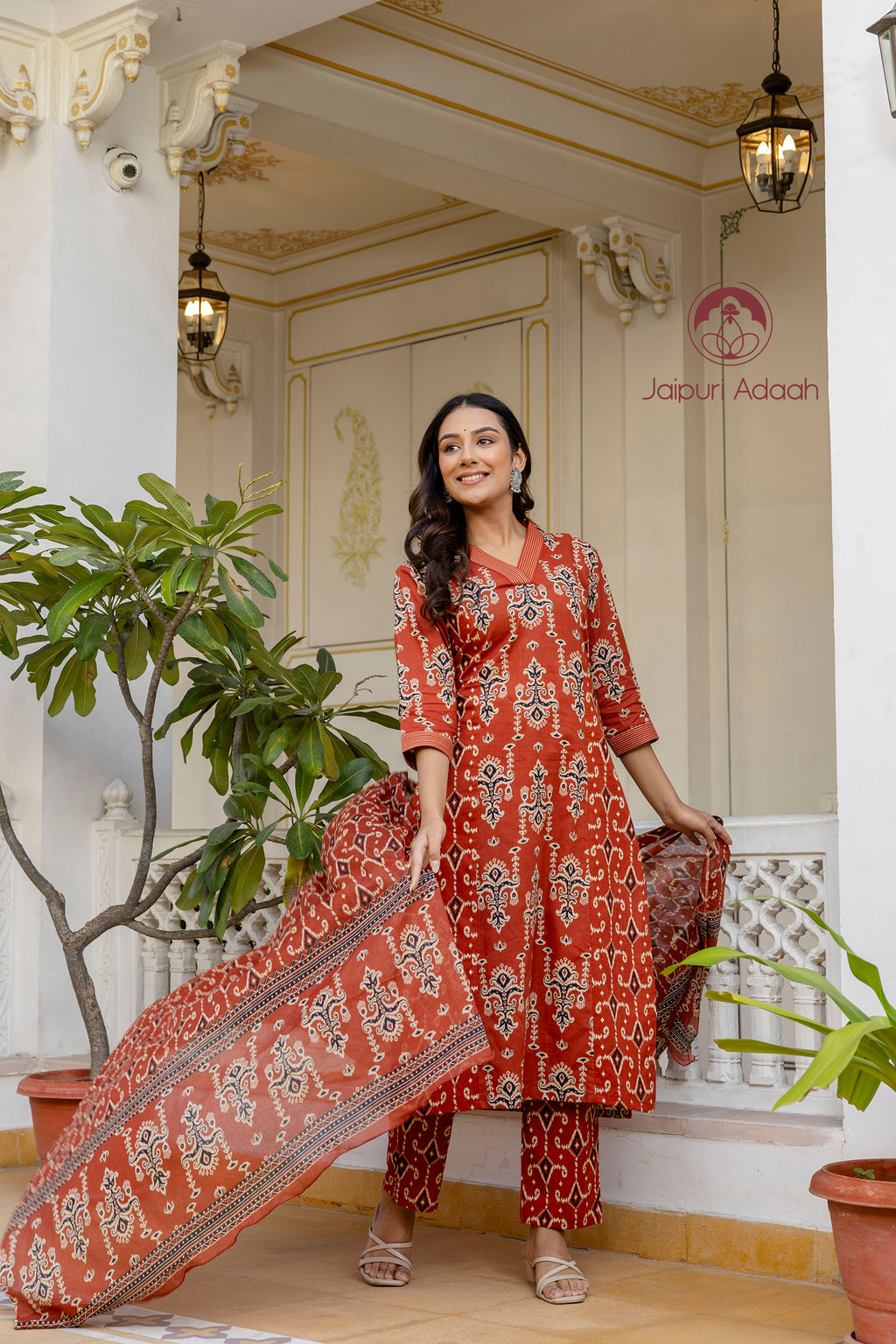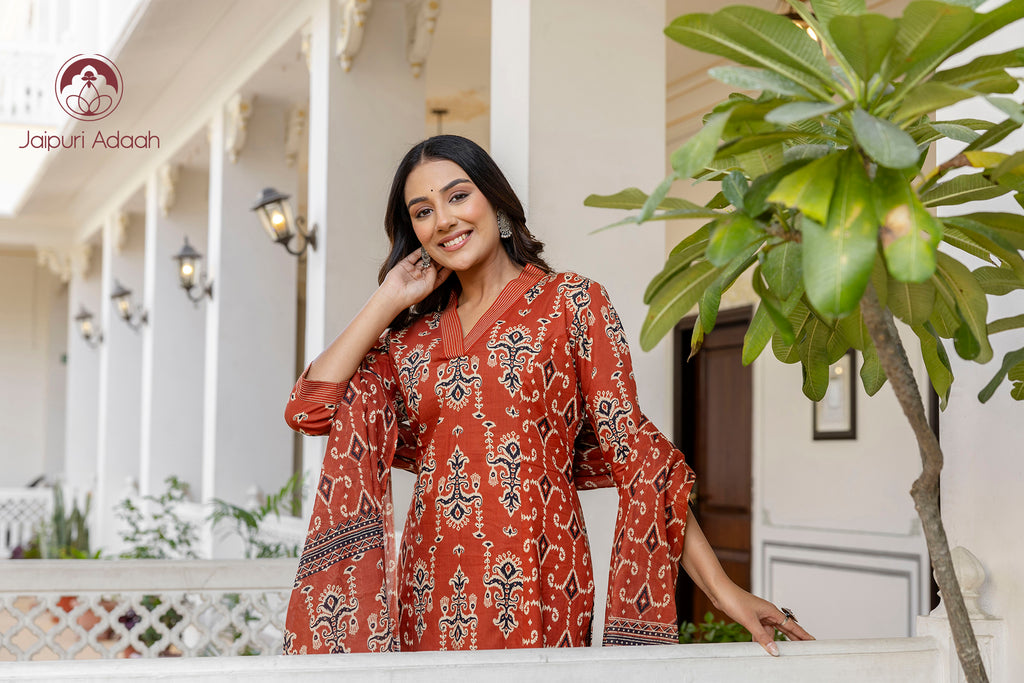 Celebrate timeless tradition with Riwaayat Charm, an elegant Ajrakh print suit set that reflects heritage artistry and graceful style. Designed in soothing tones with intricate motifs, the kurta and bottom offer a comfortable, flattering fit for all-day wear. Paired with a soft, airy mul cotton dupatta, this ensemble drapes effortlessly and adds a refined ethnic touch. Perfect for casual gatherings, festive days, or everyday elegance, this suit set brings together classic craftsmanship and modern comfort in a beautifully balanced look.