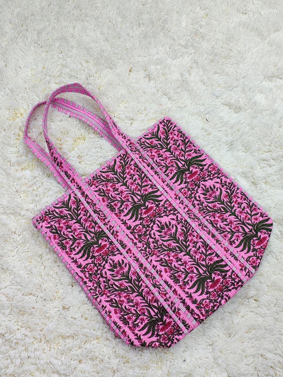 Add a pop of charm to your everyday look with our Rosy Bloom Pink Floral Quilted Cotton Tote Bag. Crafted from soft cotton fabric, this tote features a beautiful handblock-inspired floral pattern in vibrant pink hues. The quilted texture offers a plush feel and extra durability, making it perfect for daily use. With sturdy double handles and ample space inside, it’s ideal for carrying your essentials — from books and groceries to travel must-haves.