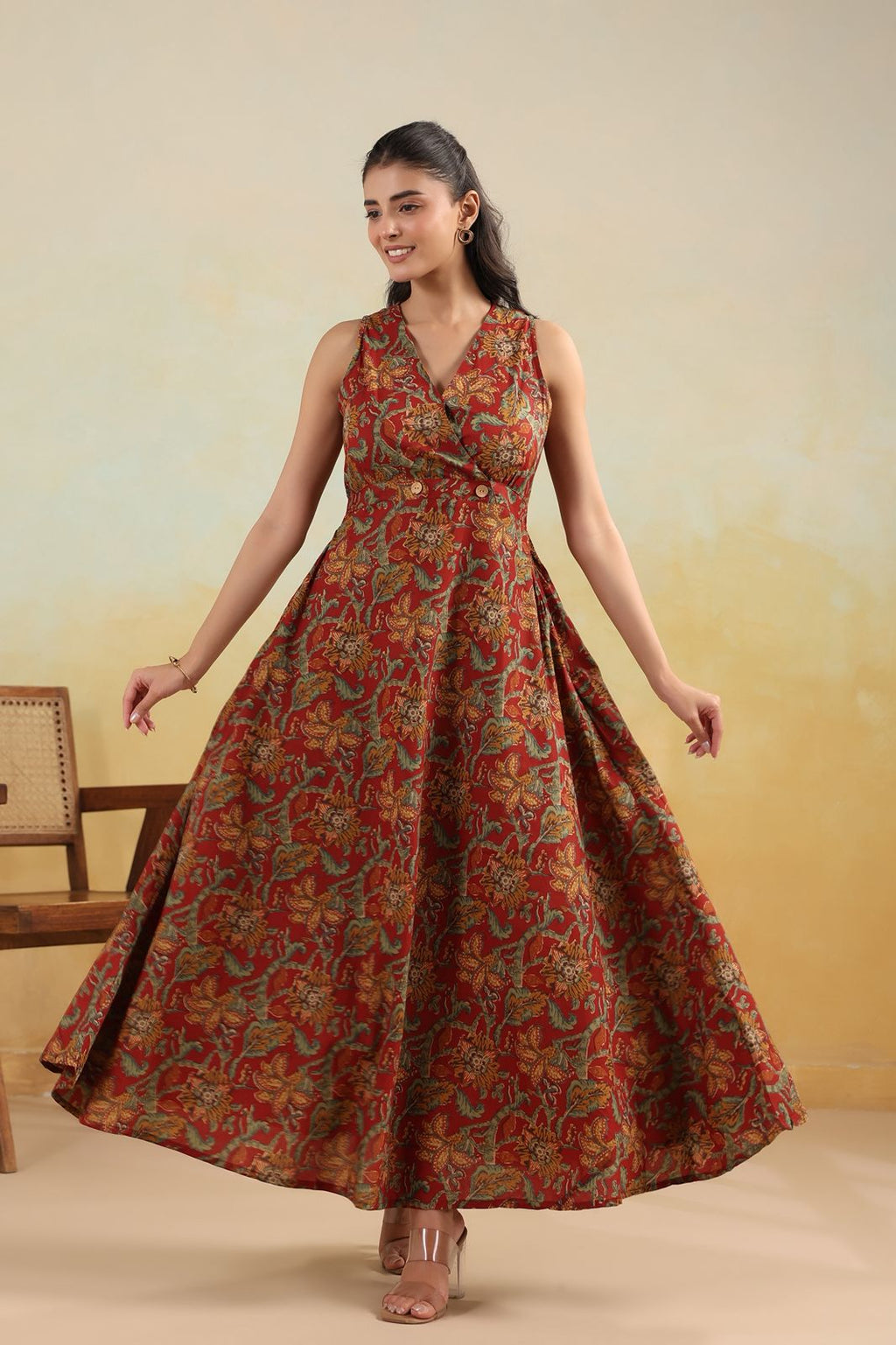Designed in rich rust tones with intricate handblock-style floral motifs, this dress is a perfect blend of heritage charm and modern sophistication. The wrap-style V-neckline enhances the silhouette, while the flared hem adds beautiful movement with every step.