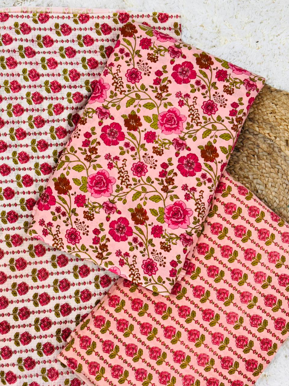 Embrace timeless elegance with our Saanjh Gulabi Garden Premium Unstitched Suit Set, designed to add a fresh floral charm to your ethnic wardrobe. Crafted in a soft gulabi (pink) base, this beautiful dress material features intricate rose-inspired prints that radiate grace and femininity.