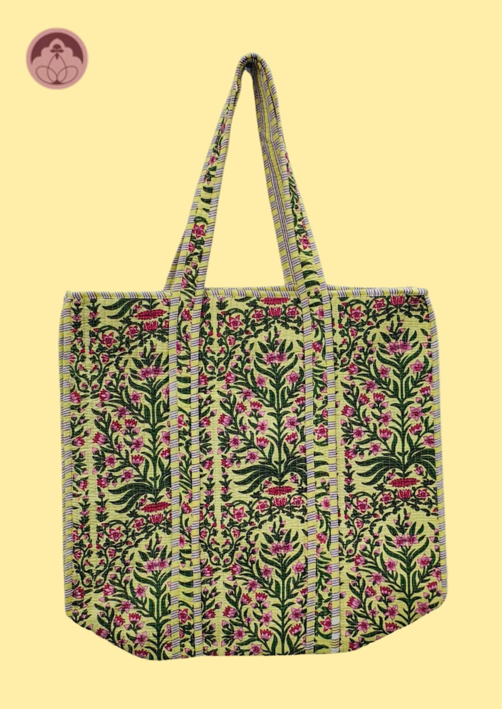 Step out in effortless charm with our Sunlit Meadow Yellow Floral Quilted Cotton Tote Bag. Crafted from premium cotton and beautifully hand-quilted, this tote blends comfort, durability, and artistry. The vibrant yellow base adorned with lush green vines and pink floral motifs brings a burst of freshness to your everyday look. Spacious and lightweight, it’s perfect for shopping, travel, or casual outings. With sturdy double handles and soft quilting, this tote ensures both style and convenience wherever you go.