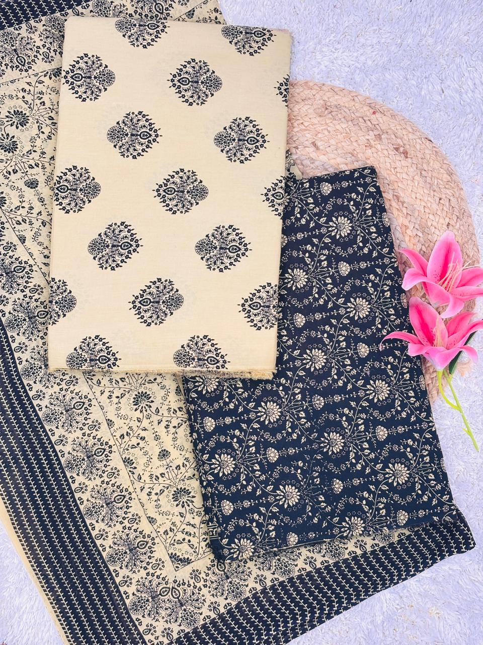 Elevate your ethnic collection with our Zariya Midnight Bloom Cotton Unstitched Suit Set, a graceful blend of classic charm and contemporary elegance. Designed in a beautiful midnight blue and ivory combination, this ensemble features intricate floral prints that exude timeless sophistication.